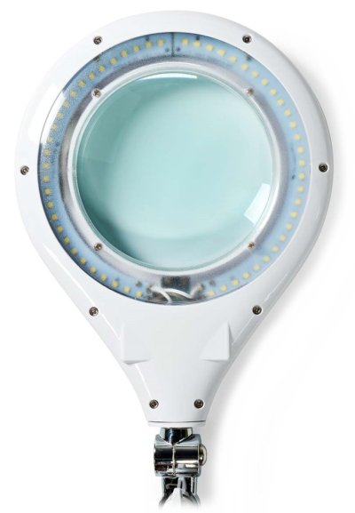 Stmívatelná LED lampička s lupou vhodná pro detailní práci s malými díly. Disponuje skleněnou čočkou o průměru 120 mm s 1,75násobným zvětšením (3 dioptrie). Lampu lze upevnit svorkou na desku stolu o tloušťce až 6 centimetrů. Flexibilní rameno o délce 125 cm, nabízející vodorovné otáčení v úhlu 260° a svislé otáčení v úhlu 210°, umožňuje perfektní nastavení osvětlení při práci. Ochranná krytka chrání čočku před nečistotami. Ovládání lampičky je velmi snadné díky dotykovým tlačítkům.