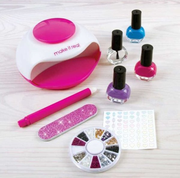 Balení obsahuje sušičku na nehty, 3 barvy laku na nehty, čirý vrchní lak, zásobník na ozdoby, zdobící tyčinka na nehty, samolepky na nehty, pilník na nehty, návod. Baleno v krabici. Vhodné od 8+.