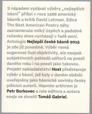 Tradiční ročenka, milovaný i nenáviděný výběr z české poezieVýběr „nejlepších“ básní nemá sugerovat iluzi objektivity, ale je výsledkem setkání dvou editorů, dvou subjektivních pohledů na poezii daného roku i na poezii jako takovou.Svazek opět představí přibližně čtyři desítky básní, jež byly uveřejněny v uplynulém roce jako básnické novinky česky píšících autorů; pozornost je věnovaná publikování knižnímu, časopiseckému, ale i na internetu. V roce 2015 se editorského žezla ujmou básník a editor Petr Borkovec a básník a publicista Tomáš Gabriel.Petr Borkovec (nar. 1970) je básník, překladatel, editor a pedagog. Za svou literární práci obdržel Cenu Jiřího Ortena a výroční Cenu Nadace Český literární fond. Kromě řady básnických sbírek publikoval také básně pro děti, krátké prózy a překlady z ruské poezie. Jeho knihy a výbory z nich byly vydány v Německu, Rakousku, Itálii a Velké Británii.Tomáš Gabriel (nar. 1983) je básník a publicista. Za svou básnickou prvotinu Tak černý kůň tak pozdě v noci (Literární salon 2012) byl nominován na Cenu Jiřího Ortena. Publikuje v časopisech Tvar, Literární.cz, Host či Souvislosti.