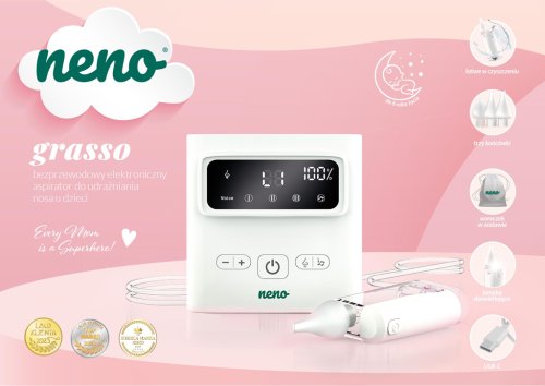 Neno Grasso je bezkabelový elektronický nosní odsavač hlenů pro děti od narození až do 6 let. Profesionální pomocník pro snadné a účinné uvolnění dýchání vašeho dítěte. Šetrně a efektivně odstraňuje hleny různé hustoty, usnadňuje dýchání a zlepšuje pohodu dětí během rýmy i v běžných situacích.