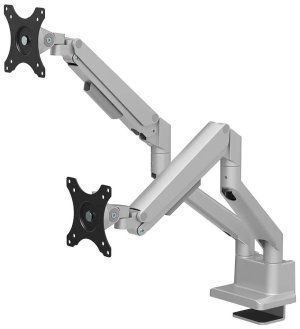 Plně pohyblivý stolní držák pro dva ploché nebo zakřivené monitory s úhlopříčkou 17" až 32" a maximální hmotností 18 kg (2× 9 kg). Všestranná technologie naklápění, otáčení a rotace umožňuje vytvořit optimální pozorovací úhel. Držák má nastavitelnou výšku 21,5–49,5 cm, hloubku 7–52,5 cm a je vhodný pro obrazovky, které odpovídají vzoru otvorů VESA 75 × 75 až 100 × 100 mm. Potěší také systém pro úhledné vedení kabelů. Balení obsahuje stolní svorku i průchodku.