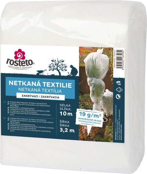 Bílá netkaná textilie je určena k ochraně rostlin před mrazem, krupobitím a živočišnými škůdci. Propouští světlo i vodu a její hmotnost 19g/m2 umožňuje zakrývání rostlin bez nutnosti budování konstrukce.