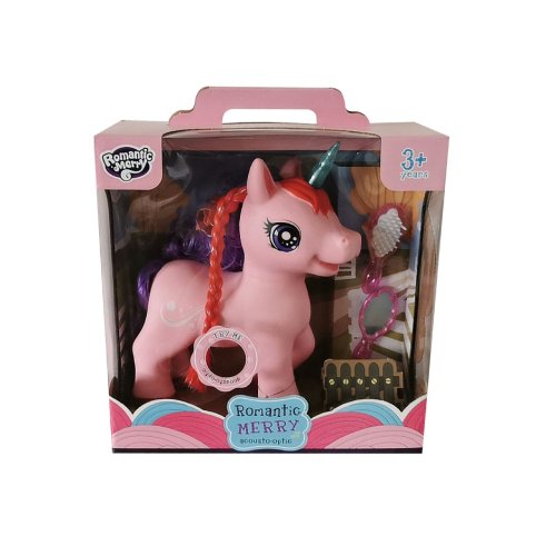 Jednorožec na baterie s příslušenstvím. Po stistknutí tlačítka na bříšku jednorožce začne vydávat zvuky a zpívat anglickou písničku a při zvuku svítí roh. Příslušenství hřebínek na česání dlouhé hřívy a zrcátko.