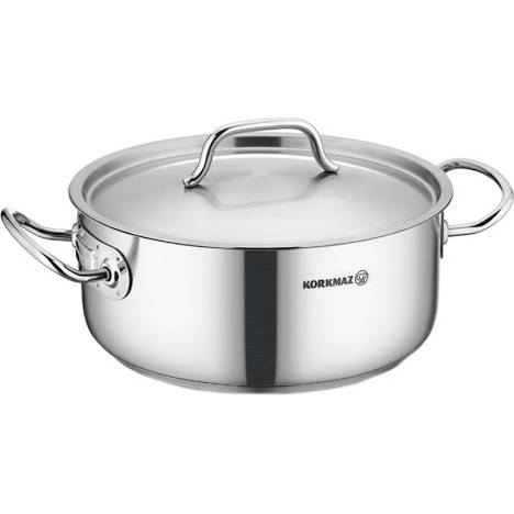 Nerezový nízký kastrol Korkmaz. Rozměry 24 x 10 cm, objem 4,5 l.