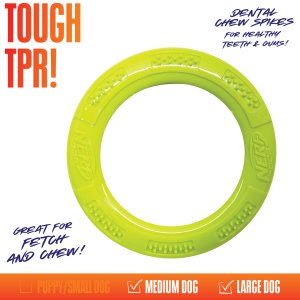 Hračka ve tvaru kroužku je určená pro interaktivní hru mezi psem a majitelem – ideální pro přetahování („tug of lane“), aportování nebo sdílenou hru. Je vyroben z odolné termoplastické gumy (TPR), která zajišťuje pevnost a dlouhotrvající výkon i při intenzivnější hře. Povrch je opatřen malými hroty, které stimulují dásně a pomáhají čistit zuby psa během žvýkání a tahání. Hračka se vyznačuje jasnými, dobře viditelnými barvami, díky čemuž ji snadno najdete při venkovní hře – v trávě, v parku nebo na zahradě.