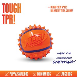 Hračka ve tvaru míčku má přibližný průměr 9 cm a je určena pro aktivní hru s vaším psem – ať už jde o házení, aportování nebo nošení. Vyrobena je z termoplastické pryže (TPR), která je pružná, odolná a vhodná pro pravidelné používání. Povrch míčku je pokryt výstupky, které zlepšují úchop psa i majitele a zároveň pomáhají při čištění psích zubů během hry. Hračka vyniká barevným kontrastním provedením, díky kterému je dobře viditelná ve venkovním prostředí – na trávě, v parku či na písku. Je vhodná pro malá až střední plemena, která mají rádi hru aportování a aktivní pohyb.