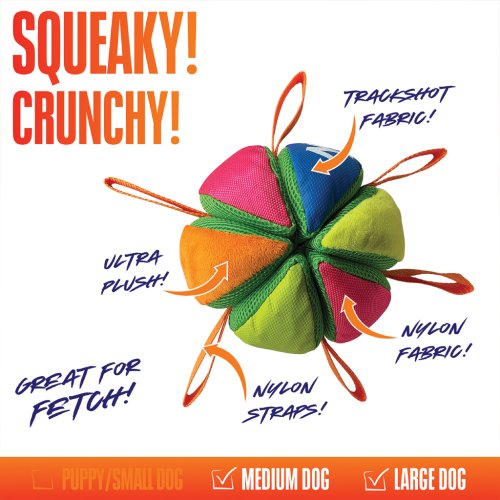 Pohodlná poutka na uchopení: míček je vybaven několika nylonovými popruhy, takže je ideální pro tahání a aportování. Kapsy na pamlsky: speciální kapsy na pamlsky dodávají hraní další vrstvu zábavy a odměny. Zvuk, který povzbuzuje ke hře: hračka kombinuje vrzavý a šustící zvuk a vytváří vrstvy zvuků a textur, které udrží psy ve střehu od prvního sousta až po poslední skok.