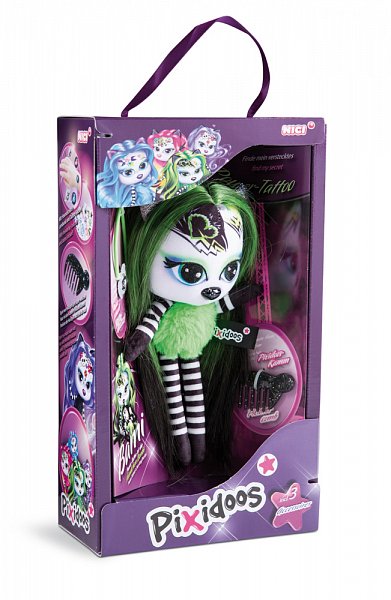 Pixidoos jsou skvělým spojením plyšové hračky a okouzlující panenky! Roztomilé a cool stylové v jednom! Pestrobarevná panenka Bami se dodává se super měkkými zelenými vlásky a 3dílnou sadou doplňků ve stylové dárkové krabičce. Sada doplňků obsahuje tetovací samolepky, třpytivý hřeben a náramek přátelství Pixidoos. Výška: 20cm. Věk: 3+