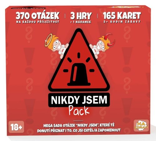 pMega sada 370 otázek “Nikdy Jsem”! Přiznáš i to, co jsi chtěl/a zapomenout. 3 hry + 1 párty náramek, ideální na oslavy, sešlosti i rande./ppTři edice - od lehkých přiznání až po totální chaos./pp bObsah balení:/b brNikdy Jsem (základní) - perfektní start večera a jistota kamkoliv. Rychle prolomí ledy a pobaví každou partu.brNikdy Jsem SPICY - pro ty, co milují perličky, tajemství a pikantní přiznání. Intimně laděný balíček s ostrými otázkami.brNikdy Jsem CRAZY - nejšílenější a nejdrsnější přiznání, co přinesou top historky a chaos, který chcete.brpPrincip her: Pokud jsi věc na kartě udělal/a, piješ/získáváš bod./pNáramek: „Co si nepamatuju – to se nestalo“ - jako párty suvenýr a motto večera./pp bVelkými výhodami jsou:/b brKompaktní krabice + jednoduchá pravidla + alko i nealko varianta + možnost hrát pár minut i několik hodin + tvorba přímo v Česku/pp bDoporučený věk:/b 18+brbPočet karet:/b 165brbPočet úkolů:/b 370brbHrací doba:/b 5+ hodinbrbMinimální počet hráčů:/b 2brbMaximální počet hráčů:/b 15/p