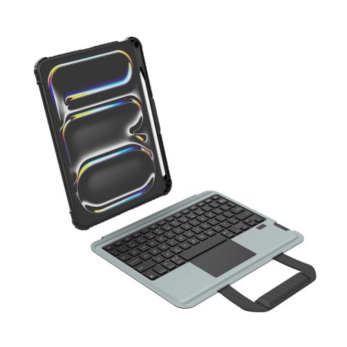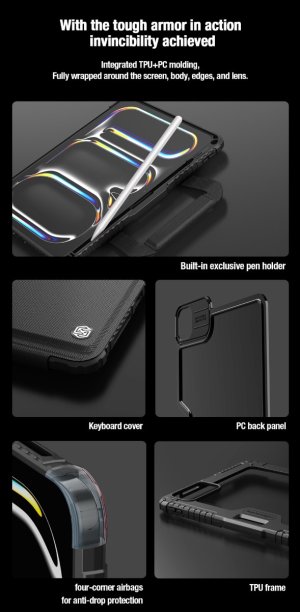 Nillkin Bumper Go Keyboard Case je víceúčelový ochranný kryt tabletu s odnímatelnou podsvícenou klávesnicí, slotem pro Apple Pencil a plynule nastavitelným úhlem tabletu. Chcete svůj tablet využívat jako mobilní kancelář, jako náhradu za těžký notebook, nebo vás prostě jen tablet baví? Tak přesně pro vás je zde víceúčelový ochranný kryt Nillkin. Kryt vám nabídne špičkově zpracovanou odnímatelnou bezdrátovou klávesnici s nízkým zdvihem, tichými a odolnými spínači a precizní profilací kláves pro to nejpohodlnější psaní. Klávesnice je také vybavena podsvícením, u kterého máte možnost si zvolit barvu a úroveň podsvícení. Na výběr je 7 různých barev a 4 úrovně podsvícení. V nepřetržitém provozu vám klávesnice vydrží až 55 hodin. Se zapnutým podsvícením se výdrž snižuje na 5 hodin. Na zadní straně naleznete praktickou opěrku pro tablet s plynulým nastavením úhlu. Na bocích se nachází praktické uši díky kterým je přenáší ještě snazší. Tablet lze opřít jak klasicky na šířku, tak i na výšku. Ať už pro práci s grafikou, psaní textů nebo čtení knih, vybere si prostě každý. Ochranný kryt se skládá z TPU + PU materiálu, který chrání váš tablet před poškozením. Navíc je opatřen zesílenými rohy a posuvným krytem fotoaparátu pro ještě větší ochranu.