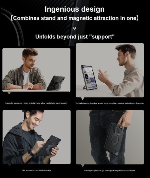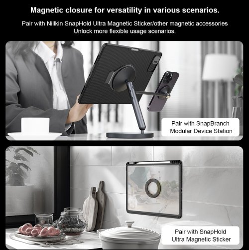 CamShield Pad zadní kryt je multifunkční kryt navržený pro tablety, který spojuje styl, ochranu a praktické funkce do jednoho. Kryt je vyroben z kombinace odolných materiálů TPU a PC, které zajišťují vynikající ochranu proti pádu, poškrábáním, nárazům i ohýbání. Má i posuvný kryt fotoaparátu, který vám ochrání čočky před poškrábáním a nežádoucím prachem. Výklopný stojánek vám umožní pohodlné sledování obrazovky pod různými úhly, což oceníte při práci, zábavě nebo videohovorech. Díky magnetické funkci lze snadno připevnit k dalším magnetickým povrchům nebo příslušenství, což přináší maximální flexibilitu při používání. Kryt má také vyhrazený slot na stylus, který vám zajistí, že ho budete mít vždy po ruce a můžete okamžitě zaznamenat každý moment inspirace. Detaily jako mírně zvýšené okraje proti poškrábání displeje, postranní protiskluzové pruhy pro lepší úchop a citlivá, přesná tlačítka dělají z tohoto krytu ideální ochranu pro váš tablet, připravenou zvládnout každou situaci.
