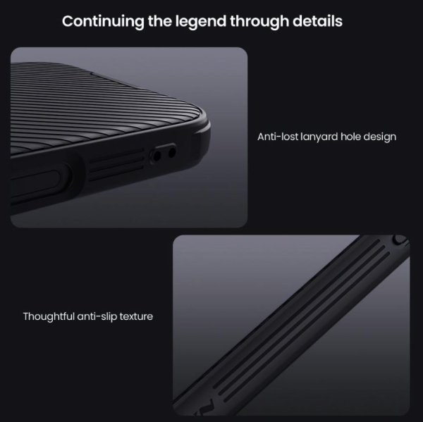 Nillkin CamShield PRO je unikátní kryt s posuvným krytem čočky fotoaparátu. Navíc je oproti klasickému CamShield unikátní v tom, že se skládá ze dvou materiálů. Záda krytu jsou vyrobena z pevného a odolného plastu a to včetně krytu fotoaparátu. Rámeček krytu je vyroben z měkčeného TPU plastu, pro nejlepší ochranu okrajů a rohů telefonu. Oba dva materiály jsou vysoce odolné proti opotřebení, ale také proti otiskům prstů a mastnotě. Přesné výřezy na ovládací prvky a potřebné konektory zajišťují pohodlnou obsluhu telefonu.