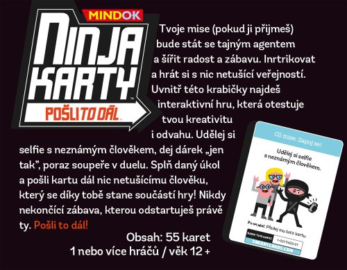 Intrikovat a hrát si s nic netušící veřejností. Uvnitř této krabičky najdeš interaktivní hru, která otestuje tvou kreativitu i odvahu. Udělej si selfie s neznámým člověkem, dej dárek „jen tak”, poraz soupeře v duelu. Splň daný úkol a pošli kartu dál nic netušícímu člověku, který se díky tobě stane součástí hry! Nikdy nekončící zábava, kterou odstartuješ právě ty. Pošli to dál!