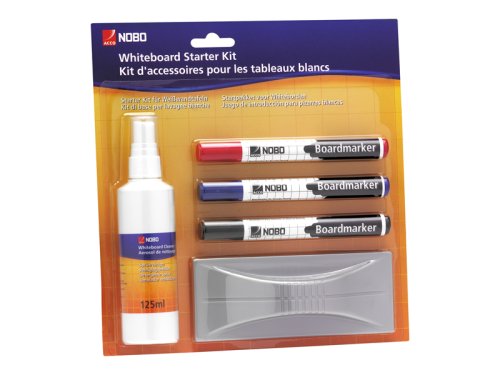 3 popisovače (černý, červený, modrý) Stěrka na tabuli Tekutý čistič ve spreji s rozprašovačem (125 ml)
