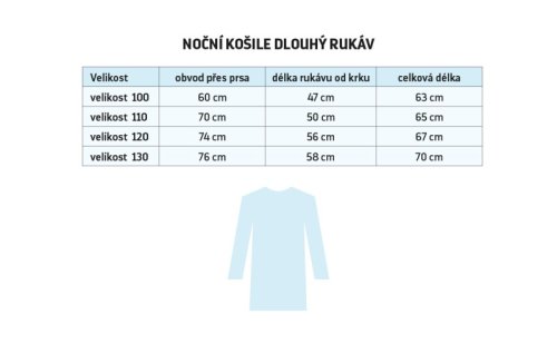 Noční košile s dlouhým rukávem materiál 95% Bavlna, 5% Elastan 180g/m2 praní na 40°C šetrné odstředění sušit v sušičce nedoporučujeme žehlit do 110°C Noční košile s dlouhým rukávem pro naše nejmenší.