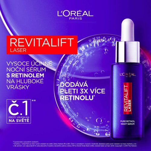 Noční sérum s vysokou koncentrací čistého retinolu redukuje i hluboké vrásky. Zanechá pleť okamžitě hydratovanou, pružnou a viditelně hladší. Již za 1 měsíc používání bude textura pleti jemnější, mladší a zářivější. Za 4 měsíce bude viditelná redukce hlubokých vrásek o 36 %.