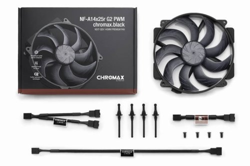 Noctua NF-A14x25r G2 PWM chromax.black je špičkový 140mm ventilátor do PC, navržený pro maximální výkon při minimální hlučnosti. Díky pokročilé aerodynamice, extrémně malé mezeře mezi lopatkami a rámem (0,7 mm) a kvalitnímu materiálu Sterrox® LCP nabízí vynikající průtok vzduchu 155,6 m³/h, vysoký statický tlak 2,56 mm H2O a kultivovaný chod až do 1500 RPM. Ideální volba pro skříně, radiátory i chladiče, kde záleží na efektivitě i tichu.