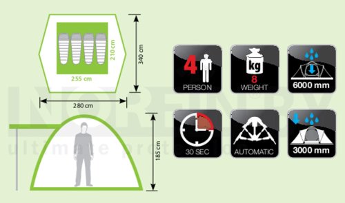 Jedná se o dvouvrstvý stan s jedním vchodem. Oceníte snadnou instalaci jednou osobou, větší předsíň pro uložení zavazadel, vstup do vnitřního stanu s moskytiérou a odnímatelnou podlahu ve vestibulu. Nechybí ani malé kapsy a všechny švy jsou utěsněny nepromokavou páskou. Průhledná okna ve vestibulu vám umožní sledovat dění kolem stanu.