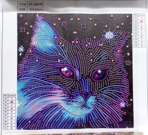 Balení obsahuje: plátno s předtištěným obrázkem, pero na aplikaci kamínků, misku na vysypání kamínků, vosk na nalepení, sadu barevných kamínků Diamantové malování - postup: Horní strana plátna je potažena lepidlem a překrytá průhlednou folií. Folii sundávejte postupně po částech tak, jak budete aplikovat kamínky. Při sejmutí celé folie najednou se může lepicí vrstva znečistit a kamínky by nemusely tak dobře držet. Plátno obsahuje znaky, které jsou uvedeny v přiložené legendě a odkazují na příslušný sáček s kamínky označený číslem. Kamínky z daného sáčku vysypejte do misky. Do hrotu pera naberte vosk, díky kterému se kamínky snadno přichytí na pero. Kamínky perem nanášejte na obrázek. Po nalepení dané barvy kamínky nasypejte zpět do sáčku a pokračujte s další barvou.