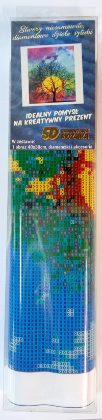 Balení obsahuje: plátno s předtištěným obrázkem, pero na aplikaci kamínků, misku na vysypání kamínků, vosk na nalepení, sadu barevných kamínků Diamantové malování - postup: Horní strana plátna je potažena lepidlem a překrytá průhlednou folií. Folii sundávejte postupně po částech tak, jak budete aplikovat kamínky. Při sejmutí celé folie najednou se může lepicí vrstva znečistit a kamínky by nemusely tak dobře držet. Plátno obsahuje znaky, které jsou uvedeny v přiložené legendě a odkazují na příslušný sáček s kamínky označený číslem. Kamínky z daného sáčku vysypejte do misky. Do hrotu pera naberte vosk, díky kterému se kamínky snadno přichytí na pero. Kamínky perem nanášejte na obrázek. Po nalepení dané barvy kamínky nasypejte zpět do sáčku a pokračujte s další barvou.