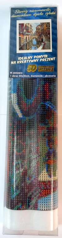 Balení obsahuje: plátno s předtištěným obrázkem, pero na aplikaci kamínků, misku na vysypání kamínků, vosk na nalepení, sadu barevných kamínků Diamantové malování - postup: Horní strana plátna je potažena lepidlem a překrytá průhlednou folií. Folii sundávejte postupně po částech tak, jak budete aplikovat kamínky. Při sejmutí celé folie najednou se může lepicí vrstva znečistit a kamínky by nemusely tak dobře držet. Plátno obsahuje znaky, které jsou uvedeny v přiložené legendě a odkazují na příslušný sáček s kamínky označený číslem. Kamínky z daného sáčku vysypejte do misky. Do hrotu pera naberte vosk, díky kterému se kamínky snadno přichytí na pero. Kamínky perem nanášejte na obrázek. Po nalepení dané barvy kamínky nasypejte zpět do sáčku a pokračujte s další barvou.
