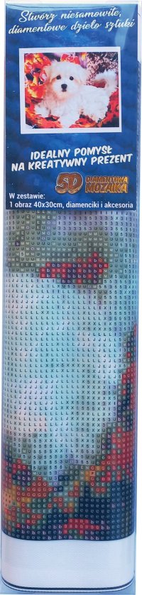 Balení obsahuje: plátno s předtištěným obrázkem, pero na aplikaci kamínků, misku na vysypání kamínků, vosk na nalepení, sadu barevných kamínků Diamantové malování - postup: Horní strana plátna je potažena lepidlem a překrytá průhlednou folií. Folii sundávejte postupně po částech tak, jak budete aplikovat kamínky. Při sejmutí celé folie najednou se může lepicí vrstva znečistit a kamínky by nemusely tak dobře držet. Plátno obsahuje znaky, které jsou uvedeny v přiložené legendě a odkazují na příslušný sáček s kamínky označený číslem. Kamínky z daného sáčku vysypejte do misky. Do hrotu pera naberte vosk, díky kterému se kamínky snadno přichytí na pero. Kamínky perem nanášejte na obrázek. Po nalepení dané barvy kamínky nasypejte zpět do sáčku a pokračujte s další barvou.