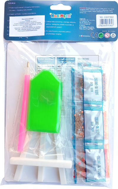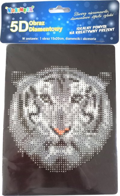 Balení obsahuje: obrázek, pero na aplikaci kamínků, misku na vysypání kamínků, vosk na nalepení, sadu barevných kamínků, stojánek Diamantové malování - postup: Horní strana plátna je potažena lepidlem a překrytá průhlednou folií. Folii sundávejte postupně po částech tak, jak budete aplikovat kamínky. Při sejmutí celé folie najednou se může lepicí vrstva znečistit a kamínky by nemusely tak dobře držet. Plátno obsahuje znaky, které jsou uvedeny v přiložené legendě a odkazují na příslušný sáček s kamínky označený číslem. Kamínky z daného sáčku vysypejte do misky. Do hrotu pera naberte vosk, díky kterému se kamínky snadno přichytí na pero. Kamínky perem nanášejte na obrázek. Po nalepení dané barvy kamínky nasypejte zpět do sáčku a pokračujte s další barvou.