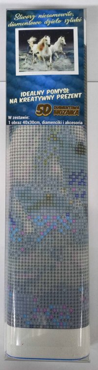 Balení obsahuje: plátno s předtištěným obrázkem, pero na aplikaci kamínků, misku na vysypání kamínků, vosk na nalepení, sadu barevných kamínků Diamantové malování - postup: Horní strana plátna je potažena lepidlem a překrytá průhlednou folií. Folii sundávejte postupně po částech tak, jak budete aplikovat kamínky. Při sejmutí celé folie najednou se může lepicí vrstva znečistit a kamínky by nemusely tak dobře držet. Plátno obsahuje znaky, které jsou uvedeny v přiložené legendě a odkazují na příslušný sáček s kamínky označený číslem. Kamínky z daného sáčku vysypejte do misky. Do hrotu pera naberte vosk, díky kterému se kamínky snadno přichytí na pero. Kamínky perem nanášejte na obrázek. Po nalepení dané barvy kamínky nasypejte zpět do sáčku a pokračujte s další barvou.