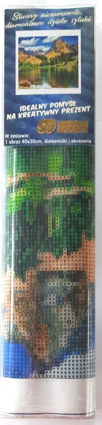 Balení obsahuje: plátno s předtištěným obrázkem, pero na aplikaci kamínků, misku na vysypání kamínků, vosk na nalepení, sadu barevných kamínků Diamantové malování - postup: Horní strana plátna je potažena lepidlem a překrytá průhlednou folií. Folii sundávejte postupně po částech tak, jak budete aplikovat kamínky. Při sejmutí celé folie najednou se může lepicí vrstva znečistit a kamínky by nemusely tak dobře držet. Plátno obsahuje znaky, které jsou uvedeny v přiložené legendě a odkazují na příslušný sáček s kamínky označený číslem. Kamínky z daného sáčku vysypejte do misky. Do hrotu pera naberte vosk, díky kterému se kamínky snadno přichytí na pero. Kamínky perem nanášejte na obrázek. Po nalepení dané barvy kamínky nasypejte zpět do sáčku a pokračujte s další barvou.