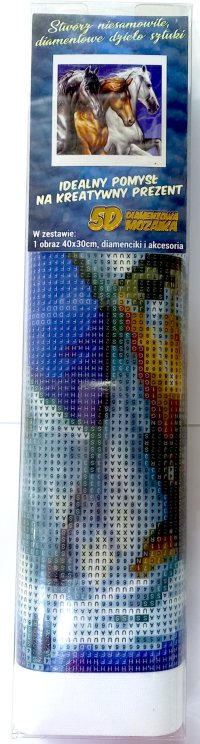 Balení obsahuje: plátno s předtištěným obrázkem, pero na aplikaci kamínků, misku na vysypání kamínků, vosk na nalepení, sadu barevných kamínků Diamantové malování - postup: Horní strana plátna je potažena lepidlem a překrytá průhlednou folií. Folii sundávejte postupně po částech tak, jak budete aplikovat kamínky. Při sejmutí celé folie najednou se může lepicí vrstva znečistit a kamínky by nemusely tak dobře držet. Plátno obsahuje znaky, které jsou uvedeny v přiložené legendě a odkazují na příslušný sáček s kamínky označený číslem. Kamínky z daného sáčku vysypejte do misky. Do hrotu pera naberte vosk, díky kterému se kamínky snadno přichytí na pero. Kamínky perem nanášejte na obrázek. Po nalepení dané barvy kamínky nasypejte zpět do sáčku a pokračujte s další barvou.