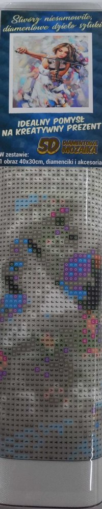 Balení obsahuje: plátno s předtištěným obrázkem, pero na aplikaci kamínků, misku na vysypání kamínků, vosk na nalepení, sadu barevných kamínků Diamantové malování - postup: Horní strana plátna je potažena lepidlem a překrytá průhlednou folií. Folii sundávejte postupně po částech tak, jak budete aplikovat kamínky. Při sejmutí celé folie najednou se může lepicí vrstva znečistit a kamínky by nemusely tak dobře držet. Plátno obsahuje znaky, které jsou uvedeny v přiložené legendě a odkazují na příslušný sáček s kamínky označený číslem. Kamínky z daného sáčku vysypejte do misky. Do hrotu pera naberte vosk, díky kterému se kamínky snadno přichytí na pero. Kamínky perem nanášejte na obrázek. Po nalepení dané barvy kamínky nasypejte zpět do sáčku a pokračujte s další barvou.