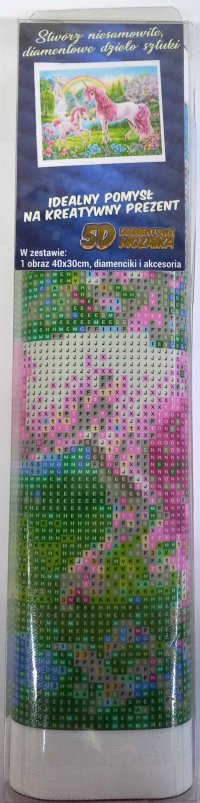 Balení obsahuje: plátno s předtištěným obrázkem, pero na aplikaci kamínků, misku na vysypání kamínků, vosk na nalepení, sadu barevných kamínků Diamantové malování - postup: Horní strana plátna je potažena lepidlem a překrytá průhlednou folií. Folii sundávejte postupně po částech tak, jak budete aplikovat kamínky. Při sejmutí celé folie najednou se může lepicí vrstva znečistit a kamínky by nemusely tak dobře držet. Plátno obsahuje znaky, které jsou uvedeny v přiložené legendě a odkazují na příslušný sáček s kamínky označený číslem. Kamínky z daného sáčku vysypejte do misky. Do hrotu pera naberte vosk, díky kterému se kamínky snadno přichytí na pero. Kamínky perem nanášejte na obrázek. Po nalepení dané barvy kamínky nasypejte zpět do sáčku a pokračujte s další barvou.