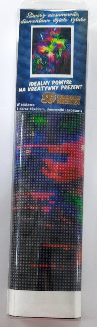 Balení obsahuje: plátno s předtištěným obrázkem, pero na aplikaci kamínků, misku na vysypání kamínků, vosk na nalepení, sadu barevných kamínků Diamantové malování - postup: Horní strana plátna je potažena lepidlem a překrytá průhlednou folií. Folii sundávejte postupně po částech tak, jak budete aplikovat kamínky. Při sejmutí celé folie najednou se může lepicí vrstva znečistit a kamínky by nemusely tak dobře držet. Plátno obsahuje znaky, které jsou uvedeny v přiložené legendě a odkazují na příslušný sáček s kamínky označený číslem. Kamínky z daného sáčku vysypejte do misky. Do hrotu pera naberte vosk, díky kterému se kamínky snadno přichytí na pero. Kamínky perem nanášejte na obrázek. Po nalepení dané barvy kamínky nasypejte zpět do sáčku a pokračujte s další barvou.