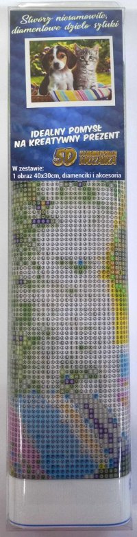 Balení obsahuje: plátno s předtištěným obrázkem, pero na aplikaci kamínků, misku na vysypání kamínků, vosk na nalepení, sadu barevných kamínků Diamantové malování - postup: Horní strana plátna je potažena lepidlem a překrytá průhlednou folií. Folii sundávejte postupně po částech tak, jak budete aplikovat kamínky. Při sejmutí celé folie najednou se může lepicí vrstva znečistit a kamínky by nemusely tak dobře držet. Plátno obsahuje znaky, které jsou uvedeny v přiložené legendě a odkazují na příslušný sáček s kamínky označený číslem. Kamínky z daného sáčku vysypejte do misky. Do hrotu pera naberte vosk, díky kterému se kamínky snadno přichytí na pero. Kamínky perem nanášejte na obrázek. Po nalepení dané barvy kamínky nasypejte zpět do sáčku a pokračujte s další barvou.