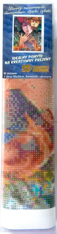 Balení obsahuje: plátno s předtištěným obrázkem, pero na aplikaci kamínků, misku na vysypání kamínků, vosk na nalepení, sadu barevných kamínků Diamantové malování - postup: Horní strana plátna je potažena lepidlem a překrytá průhlednou folií. Folii sundávejte postupně po částech tak, jak budete aplikovat kamínky. Při sejmutí celé folie najednou se může lepicí vrstva znečistit a kamínky by nemusely tak dobře držet. Plátno obsahuje znaky, které jsou uvedeny v přiložené legendě a odkazují na příslušný sáček s kamínky označený číslem. Kamínky z daného sáčku vysypejte do misky. Do hrotu pera naberte vosk, díky kterému se kamínky snadno přichytí na pero. Kamínky perem nanášejte na obrázek. Po nalepení dané barvy kamínky nasypejte zpět do sáčku a pokračujte s další barvou.