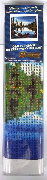 Balení obsahuje: plátno s předtištěným obrázkem, pero na aplikaci kamínků, misku na vysypání kamínků, vosk na nalepení, sadu barevných kamínků Diamantové malování - postup: Horní strana plátna je potažena lepidlem a překrytá průhlednou folií. Folii sundávejte postupně po částech tak, jak budete aplikovat kamínky. Při sejmutí celé folie najednou se může lepicí vrstva znečistit a kamínky by nemusely tak dobře držet. Plátno obsahuje znaky, které jsou uvedeny v přiložené legendě a odkazují na příslušný sáček s kamínky označený číslem. Kamínky z daného sáčku vysypejte do misky. Do hrotu pera naberte vosk, díky kterému se kamínky snadno přichytí na pero. Kamínky perem nanášejte na obrázek. Po nalepení dané barvy kamínky nasypejte zpět do sáčku a pokračujte s další barvou.