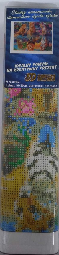 Balení obsahuje: plátno s předtištěným obrázkem, pero na aplikaci kamínků, misku na vysypání kamínků, vosk na nalepení, sadu barevných kamínků Diamantové malování - postup: Horní strana plátna je potažena lepidlem a překrytá průhlednou folií. Folii sundávejte postupně po částech tak, jak budete aplikovat kamínky. Při sejmutí celé folie najednou se může lepicí vrstva znečistit a kamínky by nemusely tak dobře držet. Plátno obsahuje znaky, které jsou uvedeny v přiložené legendě a odkazují na příslušný sáček s kamínky označený číslem. Kamínky z daného sáčku vysypejte do misky. Do hrotu pera naberte vosk, díky kterému se kamínky snadno přichytí na pero. Kamínky perem nanášejte na obrázek. Po nalepení dané barvy kamínky nasypejte zpět do sáčku a pokračujte s další barvou.
