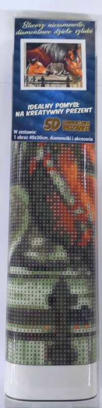 Balení obsahuje: plátno s předtištěným obrázkem, pero na aplikaci kamínků, misku na vysypání kamínků, vosk na nalepení, sadu barevných kamínků Diamantové malování - postup: Horní strana plátna je potažena lepidlem a překrytá průhlednou folií. Folii sundávejte postupně po částech tak, jak budete aplikovat kamínky. Při sejmutí celé folie najednou se může lepicí vrstva znečistit a kamínky by nemusely tak dobře držet. Plátno obsahuje znaky, které jsou uvedeny v přiložené legendě a odkazují na příslušný sáček s kamínky označený číslem. Kamínky z daného sáčku vysypejte do misky. Do hrotu pera naberte vosk, díky kterému se kamínky snadno přichytí na pero. Kamínky perem nanášejte na obrázek. Po nalepení dané barvy kamínky nasypejte zpět do sáčku a pokračujte s další barvou.