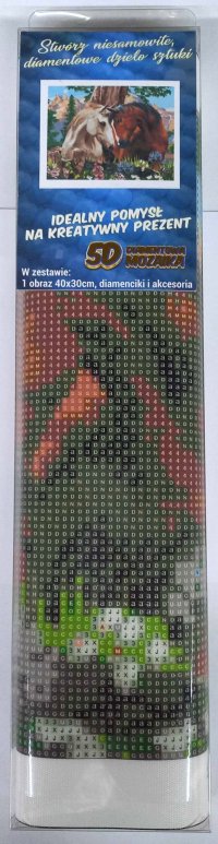 Balení obsahuje: plátno s předtištěným obrázkem, pero na aplikaci kamínků, misku na vysypání kamínků, vosk na nalepení, sadu barevných kamínků Diamantové malování - postup: Horní strana plátna je potažena lepidlem a překrytá průhlednou folií. Folii sundávejte postupně po částech tak, jak budete aplikovat kamínky. Při sejmutí celé folie najednou se může lepicí vrstva znečistit a kamínky by nemusely tak dobře držet. Plátno obsahuje znaky, které jsou uvedeny v přiložené legendě a odkazují na příslušný sáček s kamínky označený číslem. Kamínky z daného sáčku vysypejte do misky. Do hrotu pera naberte vosk, díky kterému se kamínky snadno přichytí na pero. Kamínky perem nanášejte na obrázek. Po nalepení dané barvy kamínky nasypejte zpět do sáčku a pokračujte s další barvou.