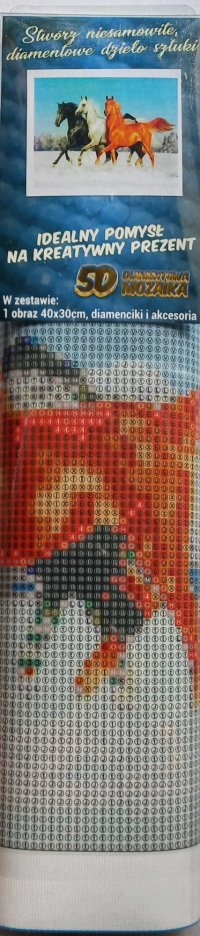 Balení obsahuje: plátno s předtištěným obrázkem, pero na aplikaci kamínků, misku na vysypání kamínků, vosk na nalepení, sadu barevných kamínků Diamantové malování - postup: Horní strana plátna je potažena lepidlem a překrytá průhlednou folií. Folii sundávejte postupně po částech tak, jak budete aplikovat kamínky. Při sejmutí celé folie najednou se může lepicí vrstva znečistit a kamínky by nemusely tak dobře držet. Plátno obsahuje znaky, které jsou uvedeny v přiložené legendě a odkazují na příslušný sáček s kamínky označený číslem. Kamínky z daného sáčku vysypejte do misky. Do hrotu pera naberte vosk, díky kterému se kamínky snadno přichytí na pero. Kamínky perem nanášejte na obrázek. Po nalepení dané barvy kamínky nasypejte zpět do sáčku a pokračujte s další barvou.