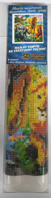 Balení obsahuje: plátno s předtištěným obrázkem, pero na aplikaci kamínků, misku na vysypání kamínků, vosk na nalepení, sadu barevných kamínků Diamantové malování - postup: Horní strana plátna je potažena lepidlem a překrytá průhlednou folií. Folii sundávejte postupně po částech tak, jak budete aplikovat kamínky. Při sejmutí celé folie najednou se může lepicí vrstva znečistit a kamínky by nemusely tak dobře držet. Plátno obsahuje znaky, které jsou uvedeny v přiložené legendě a odkazují na příslušný sáček s kamínky označený číslem. Kamínky z daného sáčku vysypejte do misky. Do hrotu pera naberte vosk, díky kterému se kamínky snadno přichytí na pero. Kamínky perem nanášejte na obrázek. Po nalepení dané barvy kamínky nasypejte zpět do sáčku a pokračujte s další barvou.