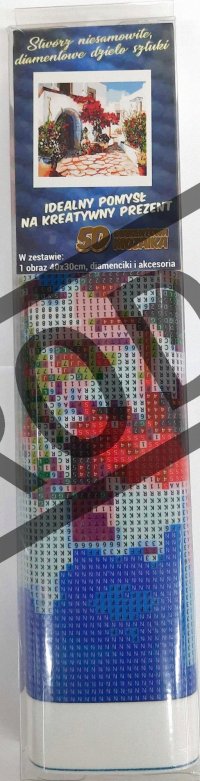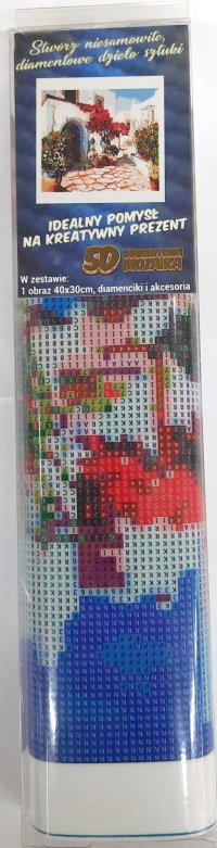 Balení obsahuje: plátno s předtištěným obrázkem, pero na aplikaci kamínků, misku na vysypání kamínků, vosk na nalepení, sadu barevných kamínků Diamantové malování - postup: Horní strana plátna je potažena lepidlem a překrytá průhlednou folií. Folii sundávejte postupně po částech tak, jak budete aplikovat kamínky. Při sejmutí celé folie najednou se může lepicí vrstva znečistit a kamínky by nemusely tak dobře držet. Plátno obsahuje znaky, které jsou uvedeny v přiložené legendě a odkazují na příslušný sáček s kamínky označený číslem. Kamínky z daného sáčku vysypejte do misky. Do hrotu pera naberte vosk, díky kterému se kamínky snadno přichytí na pero. Kamínky perem nanášejte na obrázek. Po nalepení dané barvy kamínky nasypejte zpět do sáčku a pokračujte s další barvou.