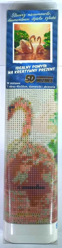 Balení obsahuje: plátno s předtištěným obrázkem, pero na aplikaci kamínků, misku na vysypání kamínků, vosk na nalepení, sadu barevných kamínků Diamantové malování - postup: Horní strana plátna je potažena lepidlem a překrytá průhlednou folií. Folii sundávejte postupně po částech tak, jak budete aplikovat kamínky. Při sejmutí celé folie najednou se může lepicí vrstva znečistit a kamínky by nemusely tak dobře držet. Plátno obsahuje znaky, které jsou uvedeny v přiložené legendě a odkazují na příslušný sáček s kamínky označený číslem. Kamínky z daného sáčku vysypejte do misky. Do hrotu pera naberte vosk, díky kterému se kamínky snadno přichytí na pero. Kamínky perem nanášejte na obrázek. Po nalepení dané barvy kamínky nasypejte zpět do sáčku a pokračujte s další barvou.