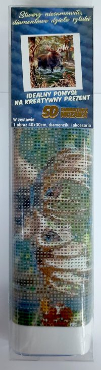 Balení obsahuje: plátno s předtištěným obrázkem, pero na aplikaci kamínků, misku na vysypání kamínků, vosk na nalepení, sadu barevných kamínků Diamantové malování - postup: Horní strana plátna je potažena lepidlem a překrytá průhlednou folií. Folii sundávejte postupně po částech tak, jak budete aplikovat kamínky. Při sejmutí celé folie najednou se může lepicí vrstva znečistit a kamínky by nemusely tak dobře držet. Plátno obsahuje znaky, které jsou uvedeny v přiložené legendě a odkazují na příslušný sáček s kamínky označený číslem. Kamínky z daného sáčku vysypejte do misky. Do hrotu pera naberte vosk, díky kterému se kamínky snadno přichytí na pero. Kamínky perem nanášejte na obrázek. Po nalepení dané barvy kamínky nasypejte zpět do sáčku a pokračujte s další barvou.