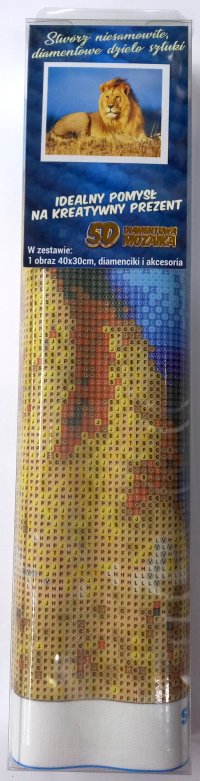 Balení obsahuje: plátno s předtištěným obrázkem, pero na aplikaci kamínků, misku na vysypání kamínků, vosk na nalepení, sadu barevných kamínků Diamantové malování - postup: Horní strana plátna je potažena lepidlem a překrytá průhlednou folií. Folii sundávejte postupně po částech tak, jak budete aplikovat kamínky. Při sejmutí celé folie najednou se může lepicí vrstva znečistit a kamínky by nemusely tak dobře držet. Plátno obsahuje znaky, které jsou uvedeny v přiložené legendě a odkazují na příslušný sáček s kamínky označený číslem. Kamínky z daného sáčku vysypejte do misky. Do hrotu pera naberte vosk, díky kterému se kamínky snadno přichytí na pero. Kamínky perem nanášejte na obrázek. Po nalepení dané barvy kamínky nasypejte zpět do sáčku a pokračujte s další barvou.