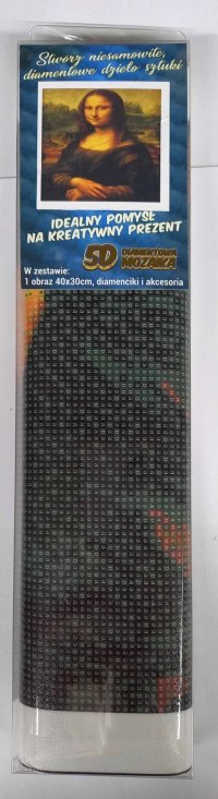 Balení obsahuje: plátno s předtištěným obrázkem, pero na aplikaci kamínků, misku na vysypání kamínků, vosk na nalepení, sadu barevných kamínků Diamantové malování - postup: Horní strana plátna je potažena lepidlem a překrytá průhlednou folií. Folii sundávejte postupně po částech tak, jak budete aplikovat kamínky. Při sejmutí celé folie najednou se může lepicí vrstva znečistit a kamínky by nemusely tak dobře držet. Plátno obsahuje znaky, které jsou uvedeny v přiložené legendě a odkazují na příslušný sáček s kamínky označený číslem. Kamínky z daného sáčku vysypejte do misky. Do hrotu pera naberte vosk, díky kterému se kamínky snadno přichytí na pero. Kamínky perem nanášejte na obrázek. Po nalepení dané barvy kamínky nasypejte zpět do sáčku a pokračujte s další barvou.