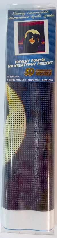 Balení obsahuje: plátno s předtištěným obrázkem, pero na aplikaci kamínků, misku na vysypání kamínků, vosk na nalepení, sadu barevných kamínků Diamantové malování - postup: Horní strana plátna je potažena lepidlem a překrytá průhlednou folií. Folii sundávejte postupně po částech tak, jak budete aplikovat kamínky. Při sejmutí celé folie najednou se může lepicí vrstva znečistit a kamínky by nemusely tak dobře držet. Plátno obsahuje znaky, které jsou uvedeny v přiložené legendě a odkazují na příslušný sáček s kamínky označený číslem. Kamínky z daného sáčku vysypejte do misky. Do hrotu pera naberte vosk, díky kterému se kamínky snadno přichytí na pero. Kamínky perem nanášejte na obrázek. Po nalepení dané barvy kamínky nasypejte zpět do sáčku a pokračujte s další barvou.