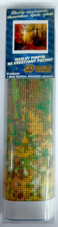 Balení obsahuje: plátno s předtištěným obrázkem, pero na aplikaci kamínků, misku na vysypání kamínků, vosk na nalepení, sadu barevných kamínků Diamantové malování - postup: Horní strana plátna je potažena lepidlem a překrytá průhlednou folií. Folii sundávejte postupně po částech tak, jak budete aplikovat kamínky. Při sejmutí celé folie najednou se může lepicí vrstva znečistit a kamínky by nemusely tak dobře držet. Plátno obsahuje znaky, které jsou uvedeny v přiložené legendě a odkazují na příslušný sáček s kamínky označený číslem. Kamínky z daného sáčku vysypejte do misky. Do hrotu pera naberte vosk, díky kterému se kamínky snadno přichytí na pero. Kamínky perem nanášejte na obrázek. Po nalepení dané barvy kamínky nasypejte zpět do sáčku a pokračujte s další barvou.