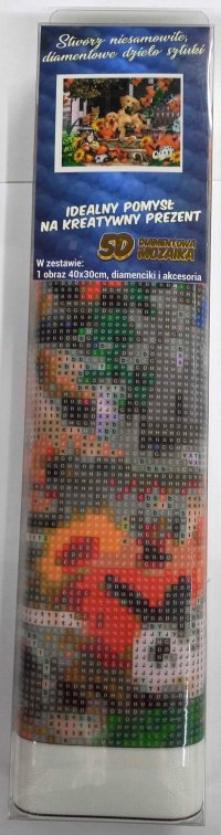 Balení obsahuje: plátno s předtištěným obrázkem, pero na aplikaci kamínků, misku na vysypání kamínků, vosk na nalepení, sadu barevných kamínků Diamantové malování - postup: Horní strana plátna je potažena lepidlem a překrytá průhlednou folií. Folii sundávejte postupně po částech tak, jak budete aplikovat kamínky. Při sejmutí celé folie najednou se může lepicí vrstva znečistit a kamínky by nemusely tak dobře držet. Plátno obsahuje znaky, které jsou uvedeny v přiložené legendě a odkazují na příslušný sáček s kamínky označený číslem. Kamínky z daného sáčku vysypejte do misky. Do hrotu pera naberte vosk, díky kterému se kamínky snadno přichytí na pero. Kamínky perem nanášejte na obrázek. Po nalepení dané barvy kamínky nasypejte zpět do sáčku a pokračujte s další barvou.