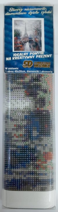 Balení obsahuje: plátno s předtištěným obrázkem, pero na aplikaci kamínků, misku na vysypání kamínků, vosk na nalepení, sadu barevných kamínků Diamantové malování - postup: Horní strana plátna je potažena lepidlem a překrytá průhlednou folií. Folii sundávejte postupně po částech tak, jak budete aplikovat kamínky. Při sejmutí celé folie najednou se může lepicí vrstva znečistit a kamínky by nemusely tak dobře držet. Plátno obsahuje znaky, které jsou uvedeny v přiložené legendě a odkazují na příslušný sáček s kamínky označený číslem. Kamínky z daného sáčku vysypejte do misky. Do hrotu pera naberte vosk, díky kterému se kamínky snadno přichytí na pero. Kamínky perem nanášejte na obrázek. Po nalepení dané barvy kamínky nasypejte zpět do sáčku a pokračujte s další barvou.